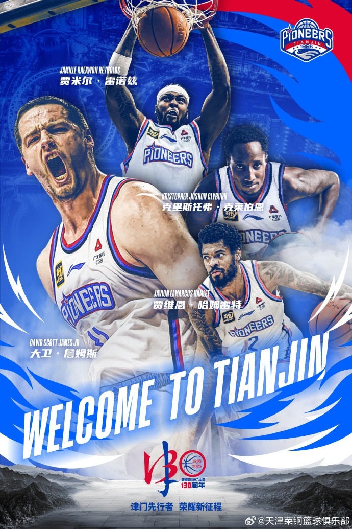 我俱乐部已于近日与大卫·詹姆斯、贾维恩·哈姆雷特、贾米尔·雷诺兹、克里斯托弗·克莱伯恩完成签约,待CBA公司审核通过相关注册资料并完成公示后,他们将代表天津先行者征战2025-2026赛季CBA联赛。