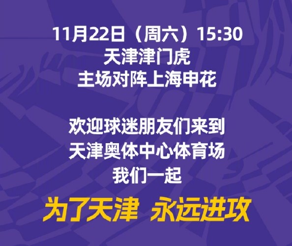 11月22日(周六)15:30,天津津门虎将在天津奥体中心体育场迎战上海申花,开票时间为11月14日中午12点。
